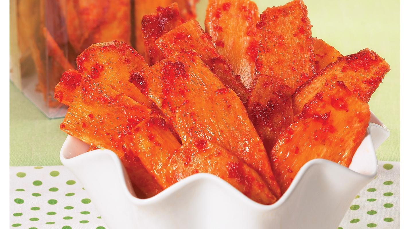 - Oleskan saus pada keripik singkong selagi panas, gunakan kuas hingga saus rata menempel di permukaan singkong. Biarkan hingga dingin, masukkan keripik singkong ke dalam kemasan plastik atau wadah bertutup rapat.