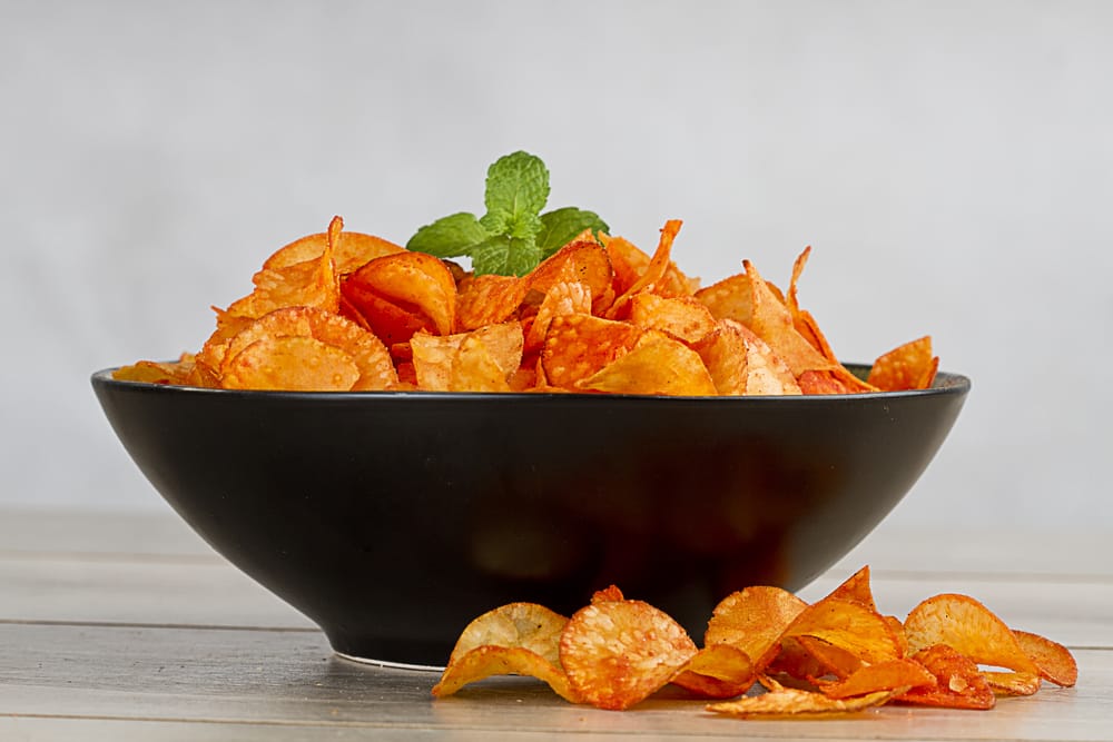- Letakkan keripik singkong goreng dalam mangkuk besar, tuangkan bumbu barbeque di atasnya, dan aduk hingga bumbu merata ke seluruh bagian keripik.